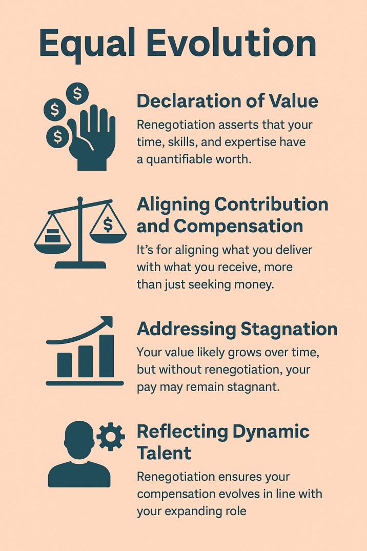 It’s not just about money—it’s about alignment between what you deliver and what you receive. Renegotiation is your opportunity to recalibrate that equation. As you grow in expertise, so too should the rewards that come with it. You’re not asking for a favor; you’re correcting a mismatch between contribution and compensation.